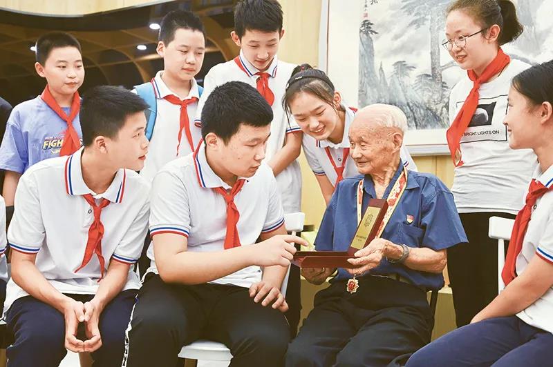 2020年8月23日,安徽省合肥市薛河灣社區(qū)舉行“聽(tīng)老兵講故事”愛(ài)國(guó)主義主題教育活動(dòng),少先隊(duì)員們聆聽(tīng)老兵講述抗戰(zhàn)故事,銘記戰(zhàn)爭(zhēng)的苦難與勝利的光榮。圖為學(xué)生們?cè)诼?tīng)九旬老兵施長(zhǎng)明講自己當(dāng)年的戰(zhàn)斗故事。中新社記者 韓蘇原/攝