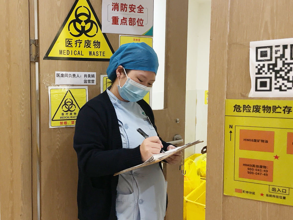 污物處理間里光線略顯昏暗,空氣中彌漫著消毒水與特殊廢棄物混合的氣味。她仔細(xì)掃視著屋內(nèi)各個(gè)角落,俯身查看已經(jīng)打包好的污物袋,時(shí)而輕輕拉扯封口處,檢查是否密封嚴(yán)實(shí)。最后,她轉(zhuǎn)身走到門(mén)口,拿起掛在墻上的記錄表格,從上衣口袋中掏出筆,鄭重簽上自己的名字。