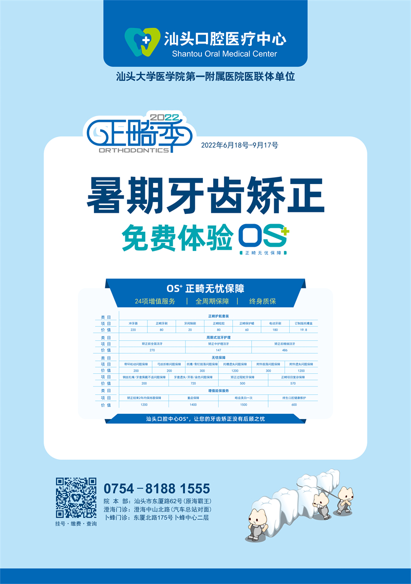 汕頭口腔醫(yī)療中心“OS+正畸無憂保障”增值延保服務,專業(yè)正畸治療+24項增值服務,讓您的牙齒矯正無后顧之憂,價值上萬元的保障項目,2022正畸季期間簽約即可免費體驗!