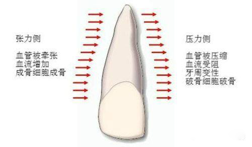 受力的牙齒移動過程中會產(chǎn)生張力側(cè)和壓力側(cè),而牙槽骨的特點是血液循環(huán)快,代謝很活躍,在受力刺激下,可一側(cè)進行骨吸收,另一側(cè)進行再生重建,循序漸進,是一個緩慢的生物改建過程。