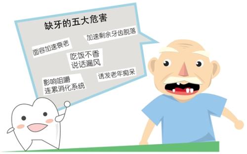 缺牙不但造成吃飯時咀嚼的不便和不自然,更直接影響人體的身體健康和生活質(zhì)量?;佳腊蔚粢院?,在牙列中間留下了空隙,容易嵌塞食物,時間久了就會發(fā)生齲病和牙周病,而與缺牙空隙相對應(yīng)的牙齒會伸長,導(dǎo)致牙根部暴露而影響其穩(wěn)固程度。因此,缺牙后還是要及時選擇鑲牙等方法修復(fù)。