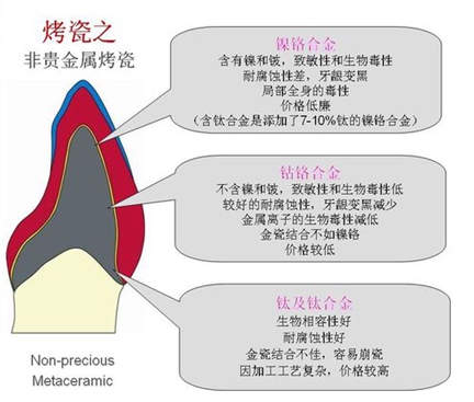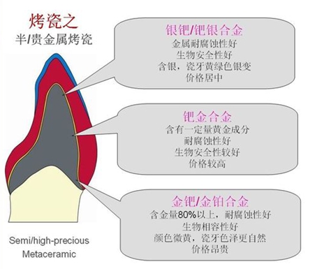 所謂烤瓷,即底層材料為金屬,按照金屬的不同,分為貴、半貴和非貴(賤)金屬烤瓷冠,價格差異也就在于此。不同的金屬主要區(qū)別在于耐腐蝕性、對人體的安全性、以及輕微的色澤差別,越貴的金屬瓷牙生物性能越好。